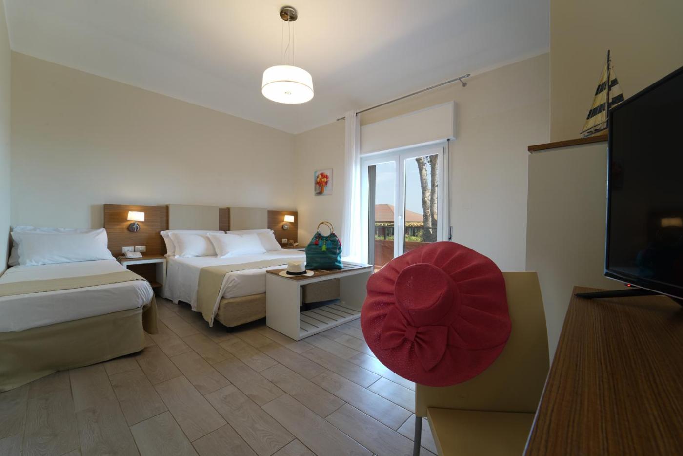 Camera Quadrupla. Camera quadrupla dotata di bagno privato con doccia, asciugacapelli, bidet,di cortesia e accappatoi. Dispone inoltre di aria condizionata, armadio, TV a schermo piatto e balcone. L’alloggio presenta 3 letti. ;