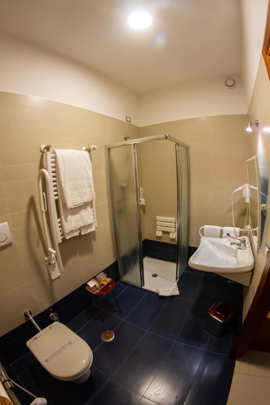 Camera Tripla con Accesso Disabili. Camera tripla provvista di bagno privato con doccia a filo pavimento, asciugacapelli edi cortesia. Dispone inoltre di aria condizionata, TV satellitare a schermo piatto, minibar, armadio, cassaforte e vista sul cortile interno.
