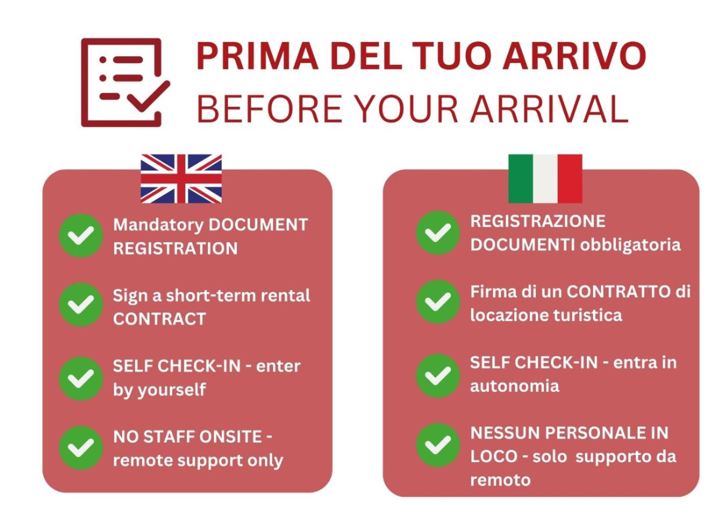 Siete pregati di comunicare in anticipo a lorario in cui prevedete di arrivare. Potrete inserire questa informazione nella sezione Richieste Speciali al momento della prenotazione, o contattare la struttura utilizzando i recapiti riportati nella conferma della prenotazione.